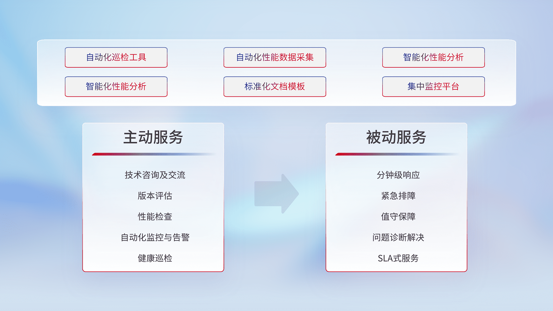 智能化工具和标准化文档,,,,保障服务质量,,,提供主动服务(包含技术咨询、、版本评估、、性能检查、、、、自动化监控与告警、、健康巡检)和被动服务包含(分钟级响应、、、、紧急排障、、值守保障、、、、问题诊断解决、、、、SLA服务)。。