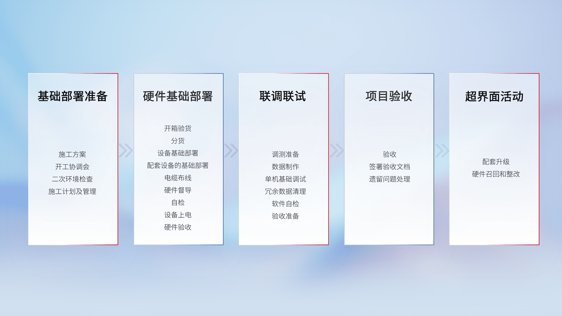 从基础部署准备、、、硬件基础部署、、联调联试、、项目验收、、、越界面活动的全过程可追溯,,保证施工质量和进度。。。